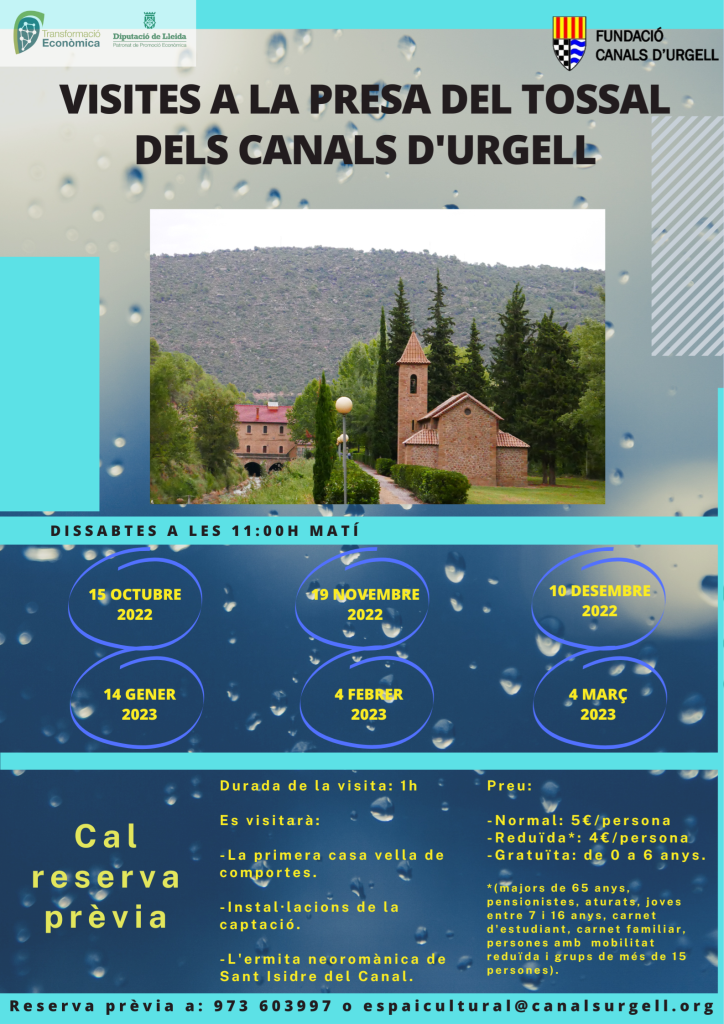 Categories Actualitat NOVA ACTIVITAT Autor de l'entrada Per ECCU Data de l'entrada 23 de setembre de 2022 No hi ha comentaris a NOVA ACTIVITAT Entrada fixada Una vegada al mes les visites guiades es traslladen a la part alta del canal. ← Presentem la restauració d’una pintura i un sagrari a l’ermita de Sant Isidre Llaurador de Ponts → ACTIVITAT PER A DOCENTS Deixa un comentari Cancel·la les respostesL'adreça electrònica no es publicarà. Els camps necessaris estan marcats amb *Comentari * Nom * Correu electrònic * Lloc web Desa el meu nom, correu electrònic i lloc web en aquest navegador per a la pròxima vegada que comenti.